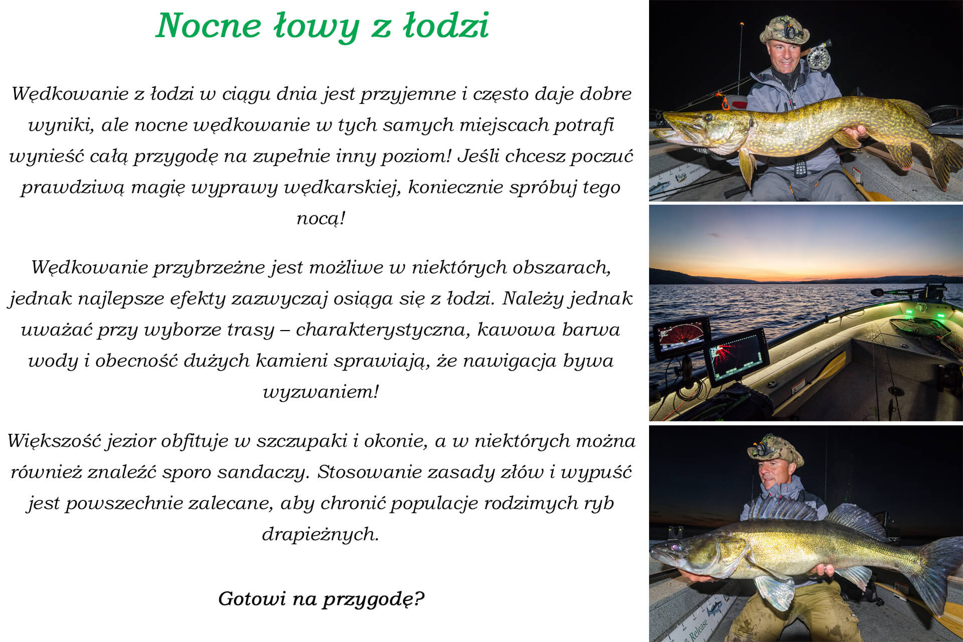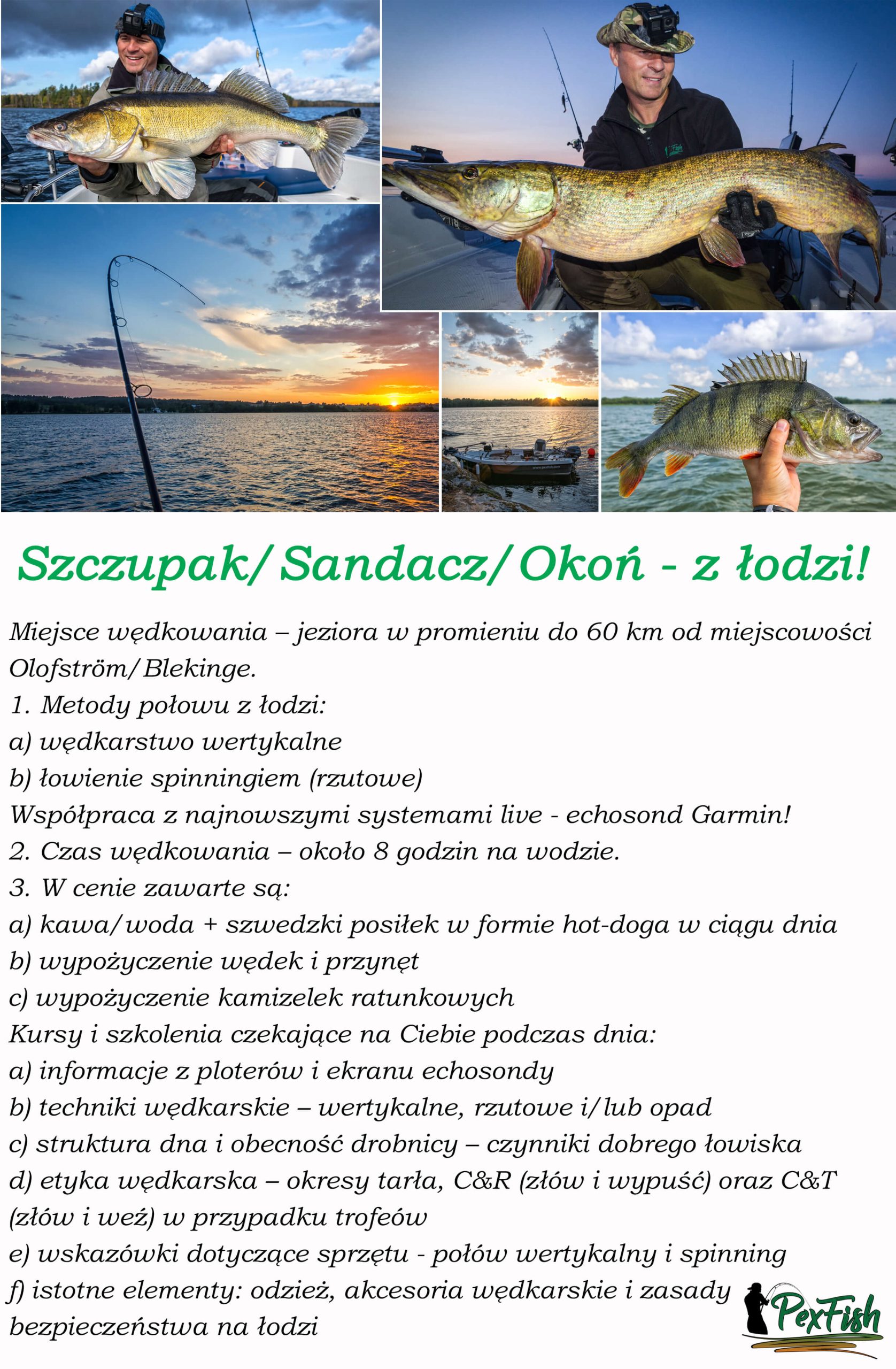 Późna wiosna, lato i jesień to przede wszystkim czas wędkowania z łodzi na lokalnych jeziorach regionów Skåne, Blekinge i Kronoberg. Głównymi gatunkami towarzyszącymi tym wyprawom są sandacz, szczupak i okoń. Tutaj łączymy wędkarską intuicję, wiedzę oraz elektronikę. W ostatnich latach ogromnie zafascynowały mnie nowoczesne rozwiązania echosond z funkcją obrazu na żywo. Oprócz lokalizowania ryb pozwalają one zanurzyć się w niezwykły podwodny świat i odkrywać magię natury kryjącą się pod taflą jeziora. Nowoczesne techniki dały mi możliwość rozwoju różnych aspektów wędkarstwa połowy ryb drapieżnych, m.in. dziennego i nocnego łowienia w strefie pelagicznej, szczególnie w kontekście połowów sandacza i szczupaka. Innowacje te w ogromnym stopniu wspierają precyzję prezentacji przynęt (wert/sharpshooting). Nie sprawiają jednak, że ryby same wskakują do łodzi (jak niestety niektórzy sądzą). Nadal kluczowe pozostaje to, co dzieje się w połączeniu: wędkarz – wędka – kołowrotek – żyłka – przynęta – i potencjalny drapieżnik na końcu tego zestawu.