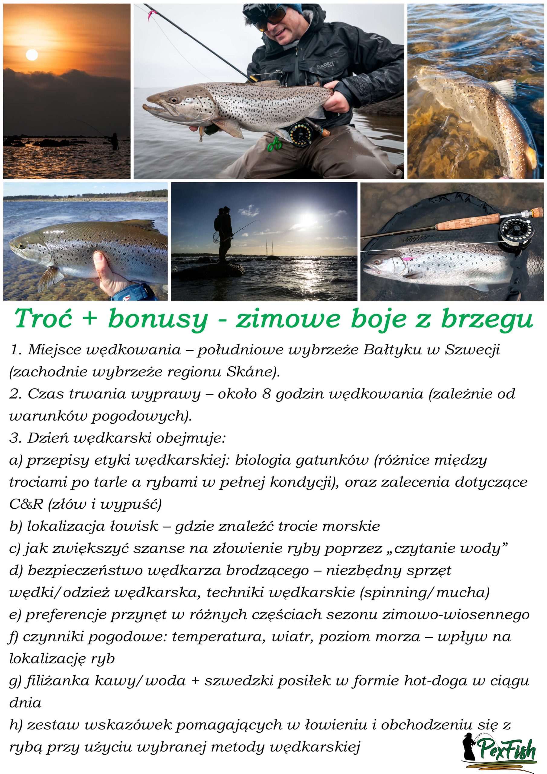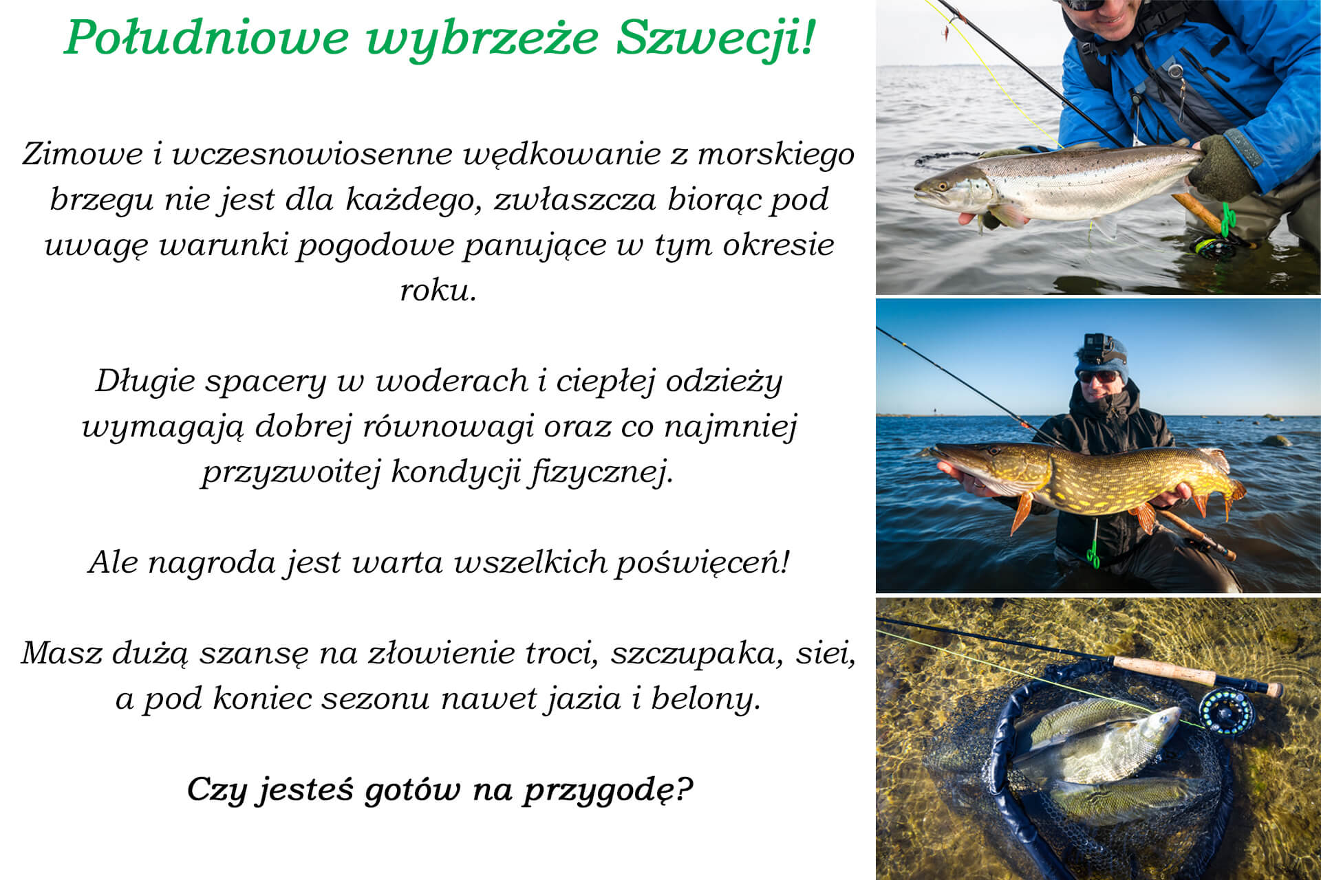 Zimą, gdy temperatury są dodatnie, można wybrać się nad pobliskie rejony nadmorskie i spróbować szczęścia w spinningu lub – w coraz częściej wybieranym przeze mnie – wędkarstwie muchowym, nastawiając się na połów niesamowicie walecznej srebrnej troci. Dość często zdarza się złowić również inne gatunki ryb, takie jak szczupak czy sieja, a w końcowej fazie tego czteromiesięcznego sezonu nawet jazia i belonę. Wędkowanie na wybrzeżach Blekinge czy Skåne nie należy do najłatwiejszych, ale dla prawdziwej, niezapomnianej przygody warto się poświęcić.